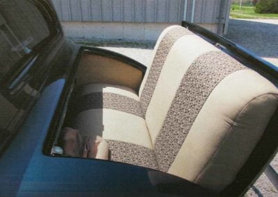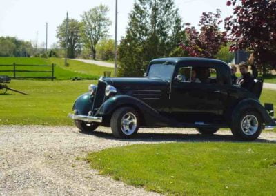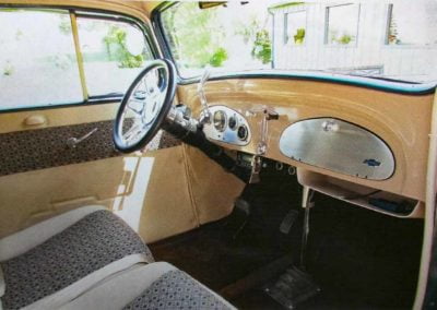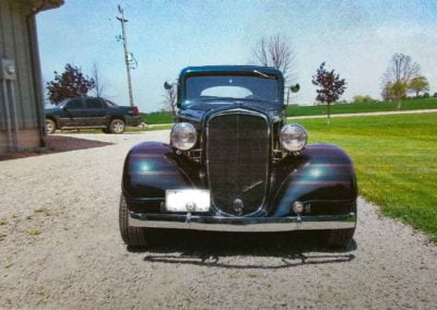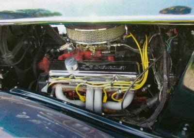 I call her a Girl Friendly Car! She’s an automatic with a 350 small block, power steering and power brakes disk front/drum rear. Original steel body and wood frame with glass fenders. Has a working Rumble seat as well and the back window winds down. Dark green metallic pearl is the colour a gem in the sunlight as sometimes it black, sometimes blue, sometimes green!