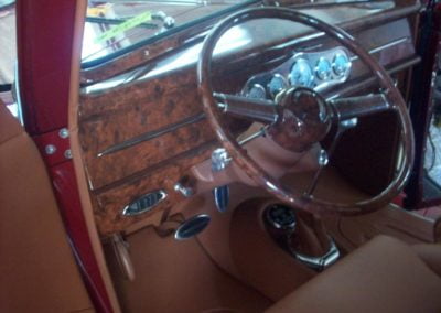 The interior is all custom-made as was the rear seat and truck area. All window frames and dash and steering wheel were hand wood grained. The tires are Falken and the rims are American racing.