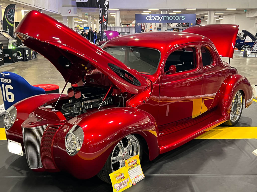 We did some subtle body changes but no chopping. The color is apple red Kandy over meteor maroon. 9 coats then clear coat finish. Buffed out and gleaming in the sun. Gary from Motorama watched my car over the last 4 years, each year asking John when it is going to be completed. Last September he asked John again saying lets go and get this thing in the Motorama car show. It was put on display in the grand hall as you walked in. Our 1940 Ford Coupe was selected as one of the top 10 cars in the entire show as well winning best in class interior and best paint.