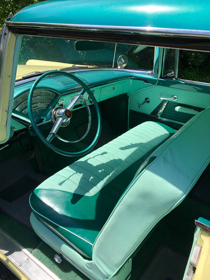 It was repainted and a new interior installed in 1993 along with the continental kit. Its features include AM radio, tinted glass, automatic transmission, full wheel covers, V-8 292 cubic inch engine, fender skirts and the battery is a “Motorcraft” 6 volt style.