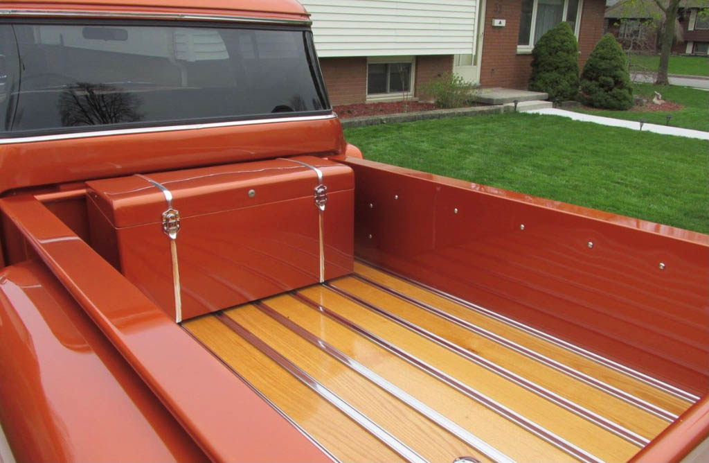 I had the 283 Chevrolet engine and a 200 R4 transmission rebuilt. The power brake assembly was installed on the frame under the cab. The power steering rack and pinion was installed as well as the rear fuel tank. The new box, tailgate and stainless strips were purchased from Pros Pick in Arthur. The wood in the box was rough cut oak that I planed, cut and finished.