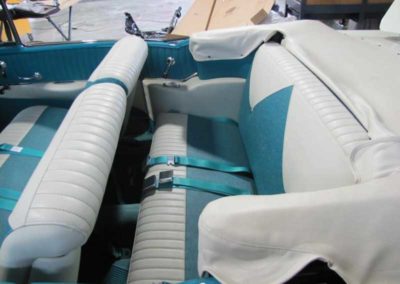 “This vehicle is a ’56 Chevy Bel Air Convertible, 265 CID V8, three-on-the-tree transmission, in original colours Twilight Turquoise/India Ivory, in show condition. It was a rotisserie/frame-off total restoration down to the bolts, and was made at the GM facility in Tarrytown, New York in 1956.