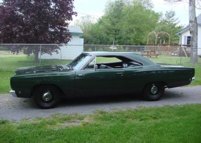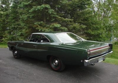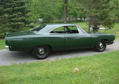The Road Runner is a two door hard top with dark green metallic paint and a black interior. The engine when purchased was a 383CI with a factory four speed transmission and 323 rear gears. Magnum 500 wheels with red line Goodyear tires along with a décor package, which was also ordered as part of the car options.