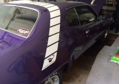 “I’ve owned this car for a few years now. It’s plum crazy purple with all the proper decals and badging. It has a black rear go wing with black deluxe sport interior and black bucket seats.