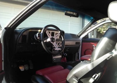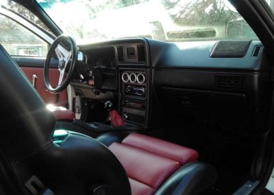 The interior was a big job but well worth the wait, because the result was so amazing. We installed a pair of older-style Recaro seats Cathy found online from a 1979 Indy Pace Car. The door panels were modified to match the seat’s black and cranberry red leather.