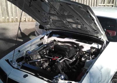 A supercharger was added providing between eight and 14 pounds of boost pressure. Power is backed by a Ford heavy duty Borg Warner T5 transmission through an overbuilt custom drive shaft and Ford 8.8 axle.
