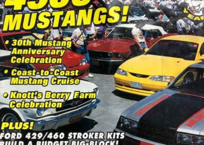 But then my interest really peaked, when he showed me a copy of the Dec 94’ issue of Mustang Monthly where the 94’ car was featured. Then he brought out the September 94’ issue of Mustangs & Fords magazine that showed this same car on the front cover again. It had a story of 4500 Mustangs that showed up at Charlotte Motor Speedway for the 30th Anniversary of the Mustang celebrated that previous summer. He then showed me a photo of the car parked outside the Nascar garage. He went on to say that the car was professionally driven at the track and reached speeds of 140 MPH.